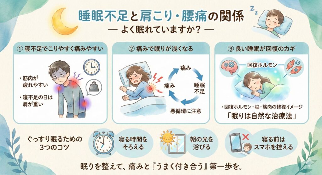 実は、睡眠と肩こり・腰痛には深い関係があります。近年の研究では、睡眠不足が痛みの感じ方を強くすることが分かっています。